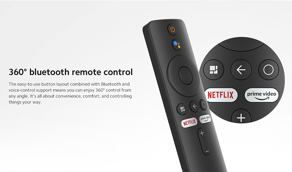 360° Bluetooth + IR remote control: The intuitive button layout and Bluetooth allows you to access your favorite content much quicker from any angle. With the built-in IR, you can also control power and volume on your TV or soundbar, all with a single remote.